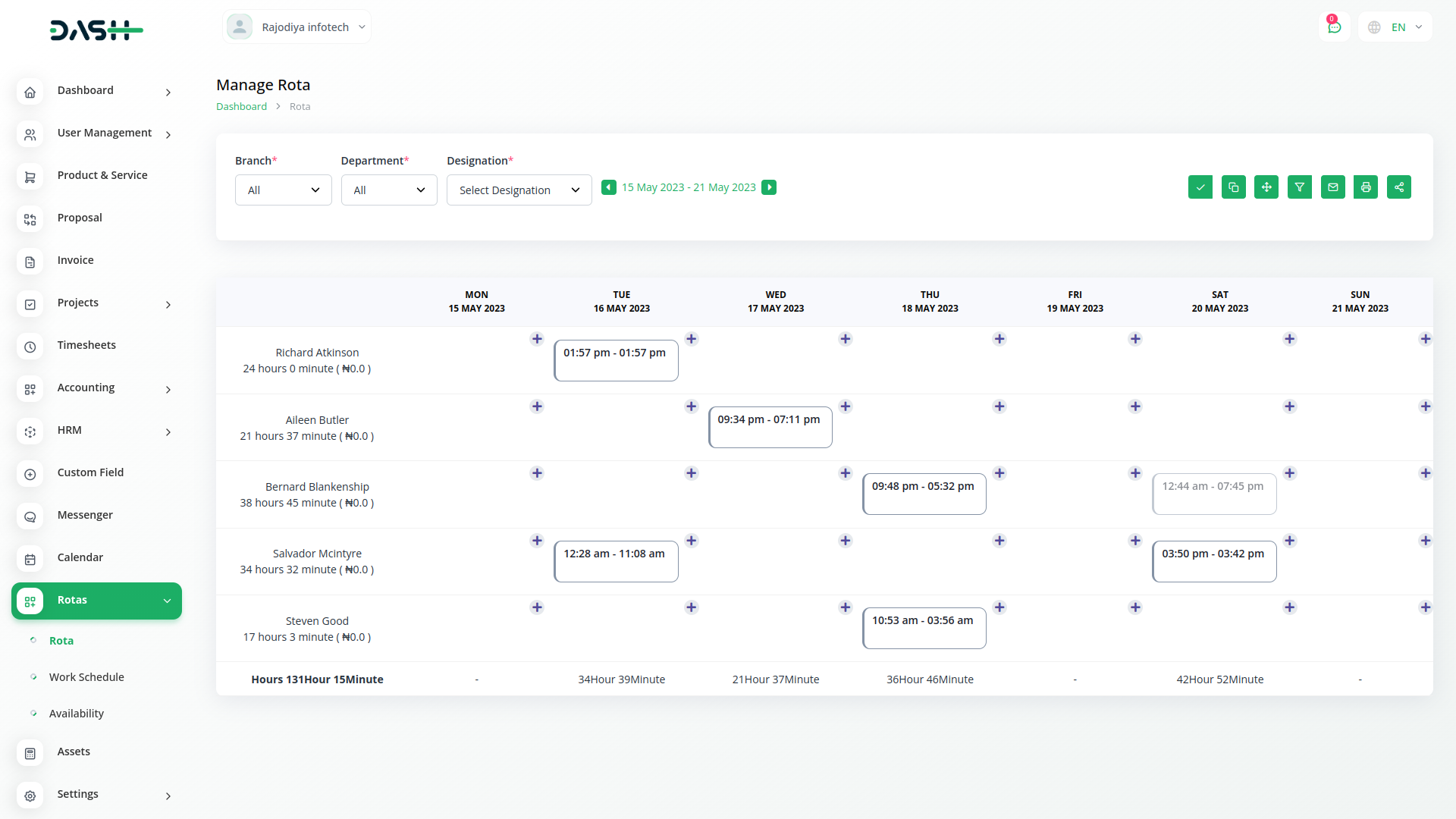 The dashboard would offer a monthly calendar view with general details about assigned users and costs incurred on any given day at a specific location. You can filter the details by selecting specific roles or all, based on your needs.